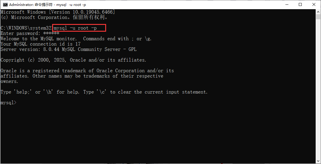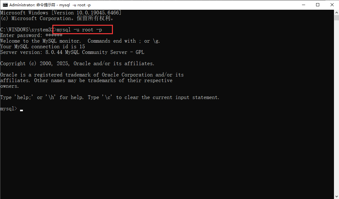 输入“mysql -u root -p”,然后输入root账户的密码,即可进入MySQL的命令空间。
