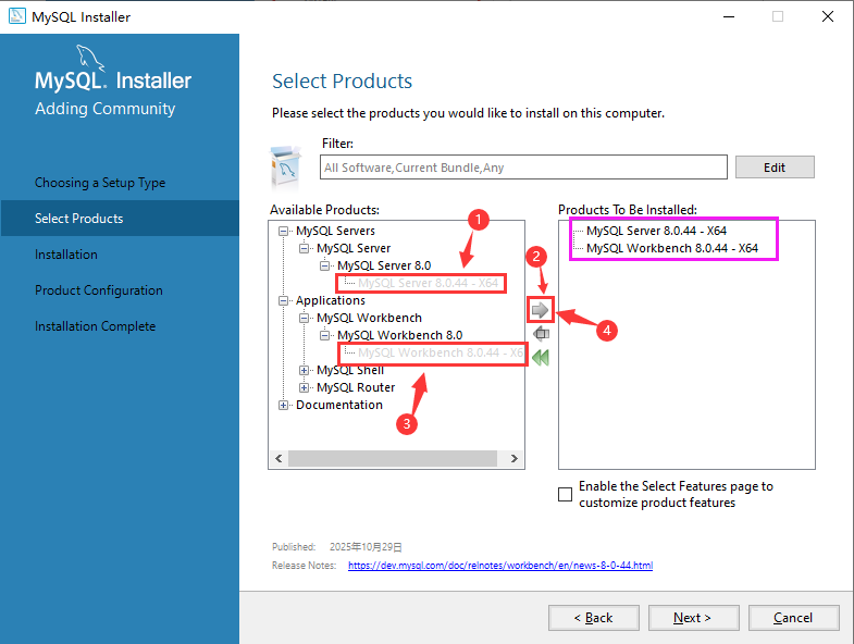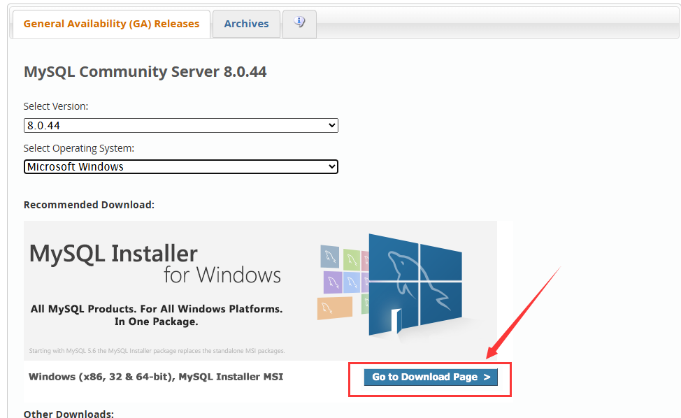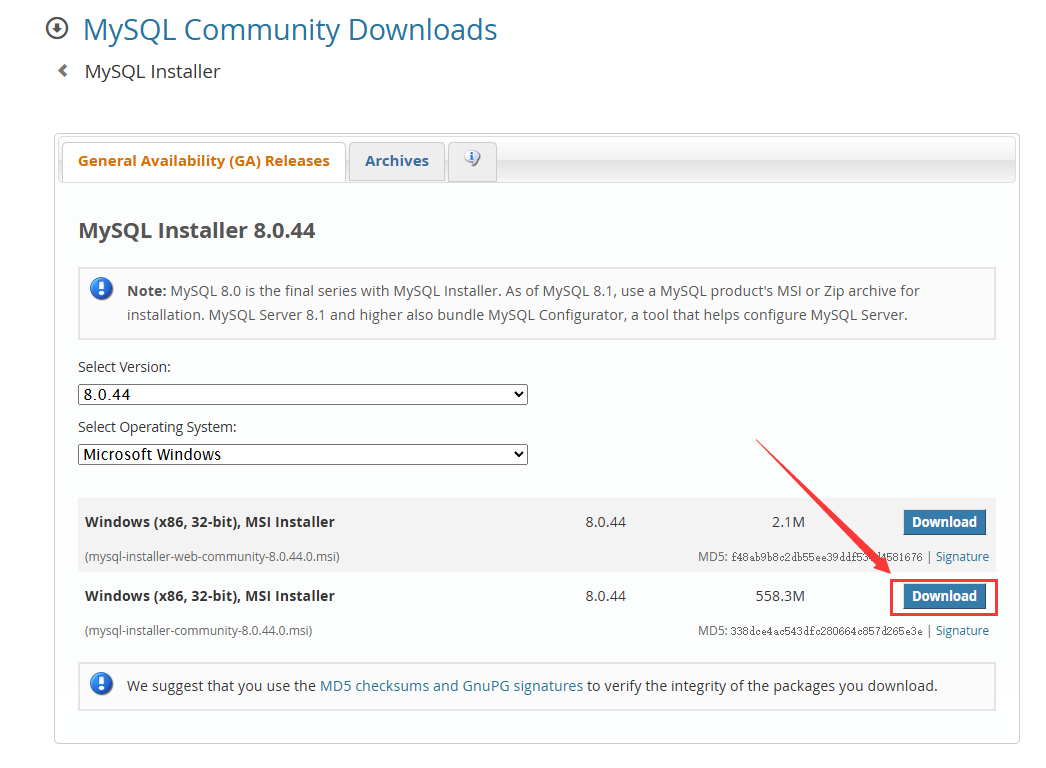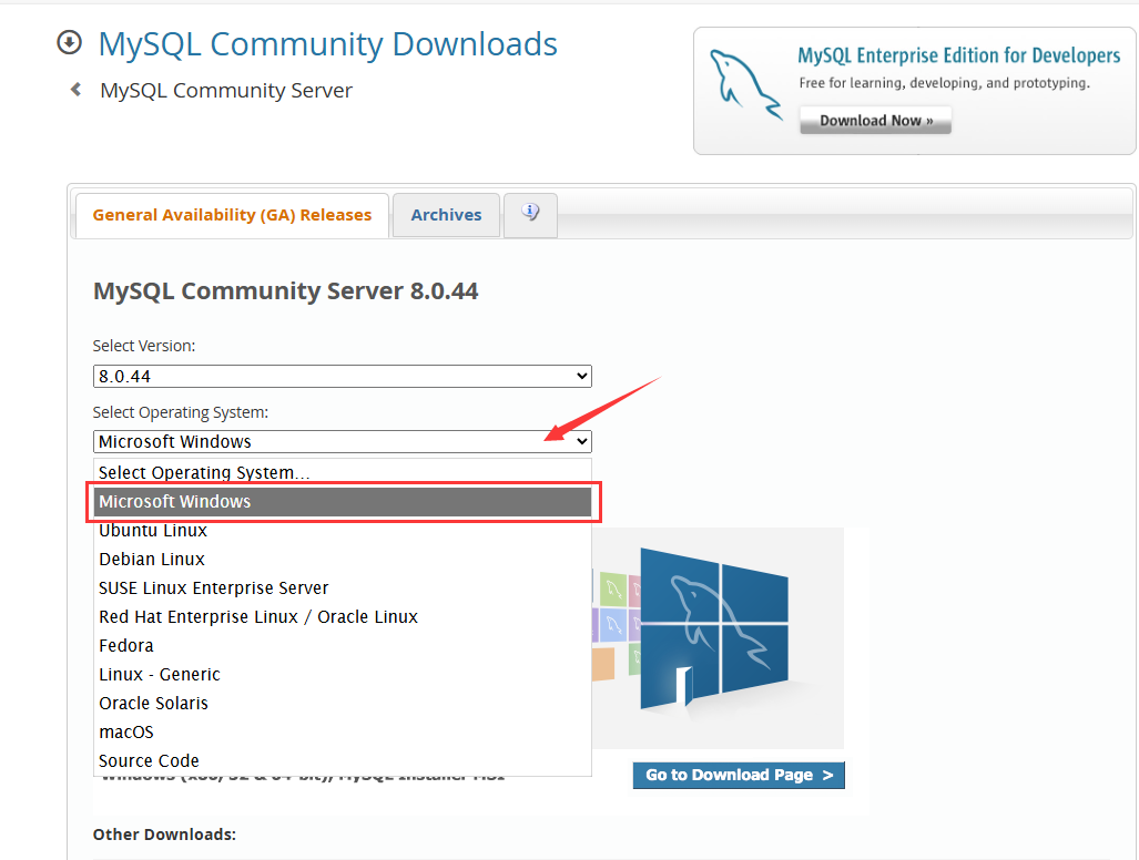 2. 选择“8.0.44”版本和“Microsoft Windows”系统。