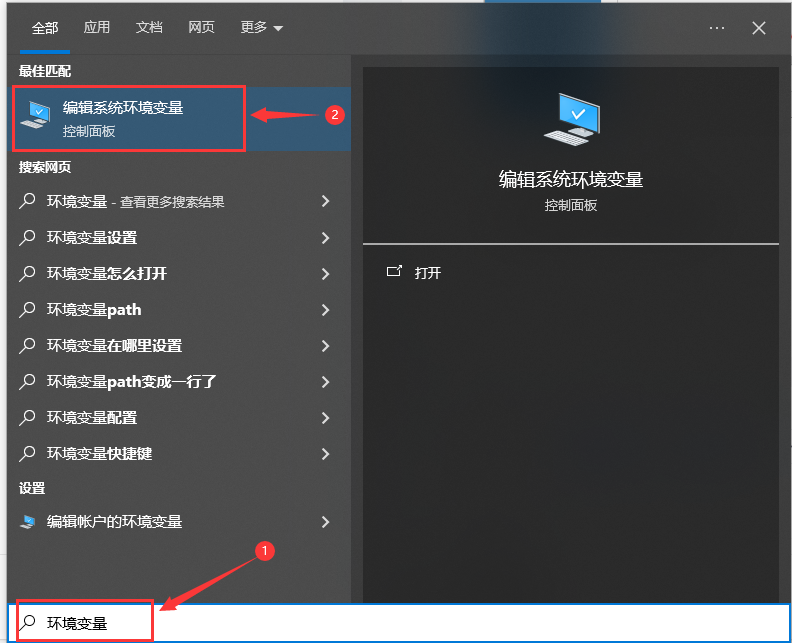 1.按 Win+s 键,搜索“环境变量”,点击搜索到的“编辑系统环境变量”。