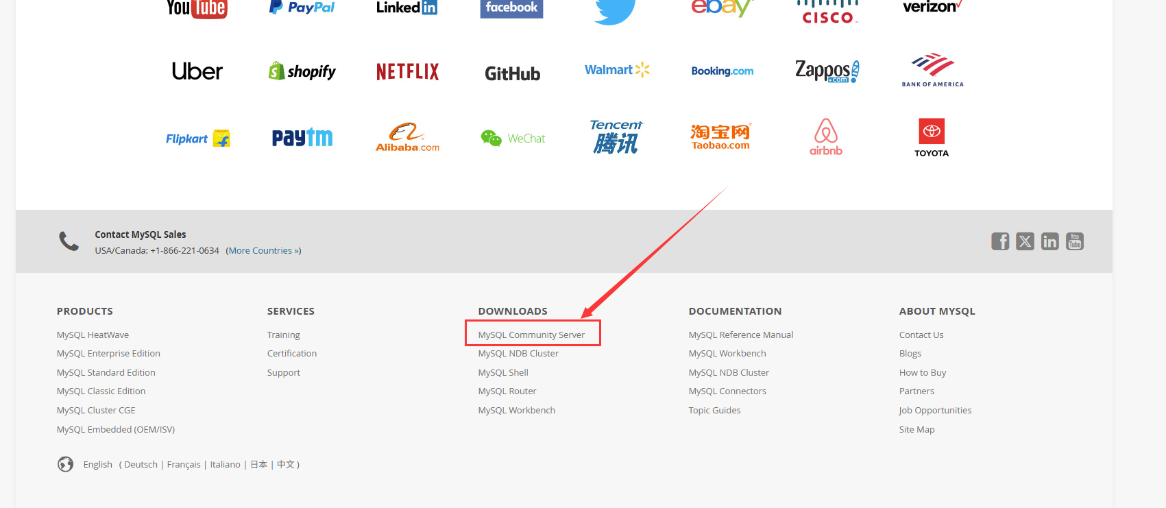 1. 访问官网 https://www.mysql.com/ ,滑动到网页最底部,点击“MySQL Community Server”。