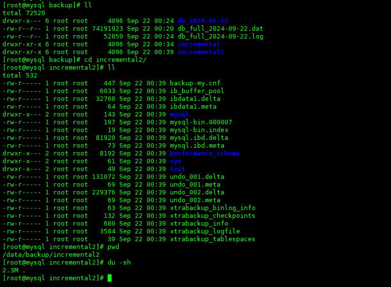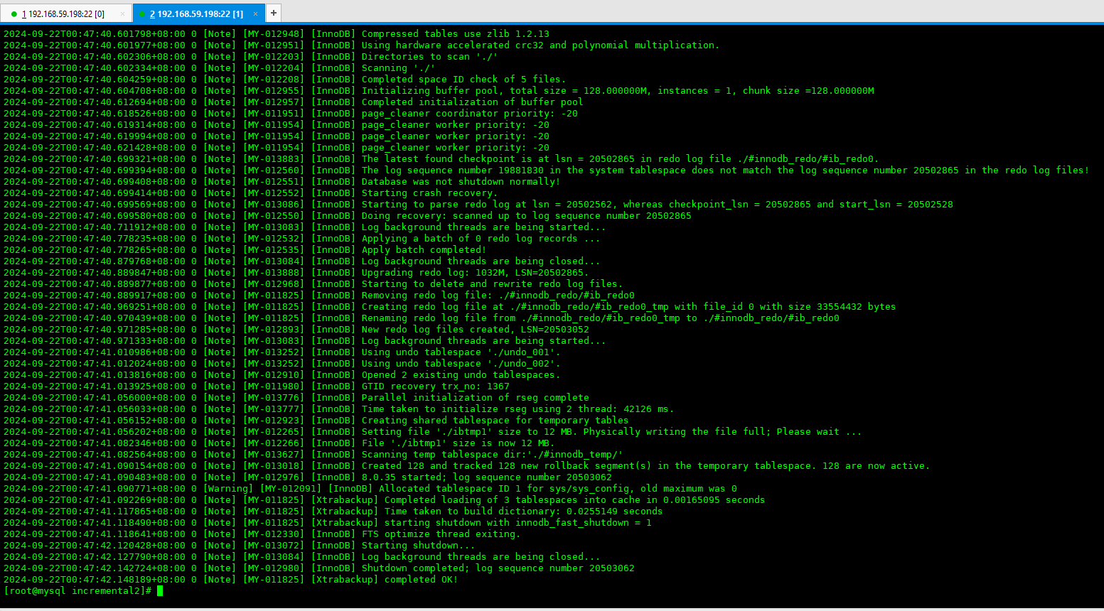 [root@mysql incremental2]# xtrabackup --defaults-file=/etc/my.cnf --prepare --target-dir=/data/backup/db_2024-09-22 #备份文件一致性检查