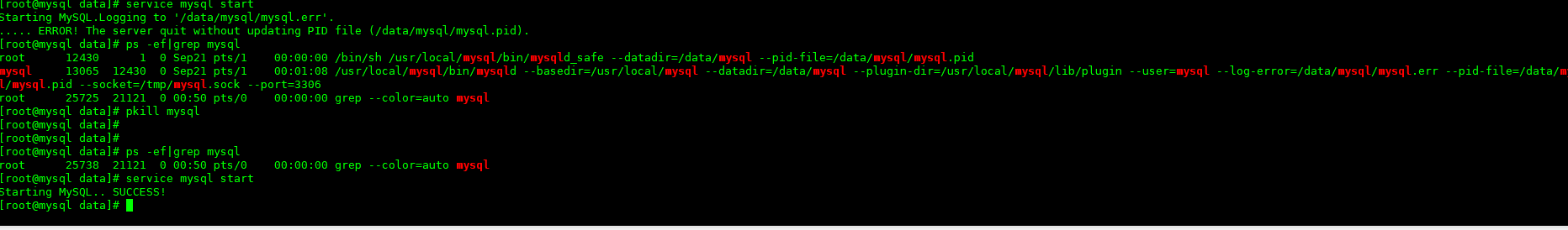[root@mysql data]# service mysql start #如果起不来,需要杀掉之前的进程。