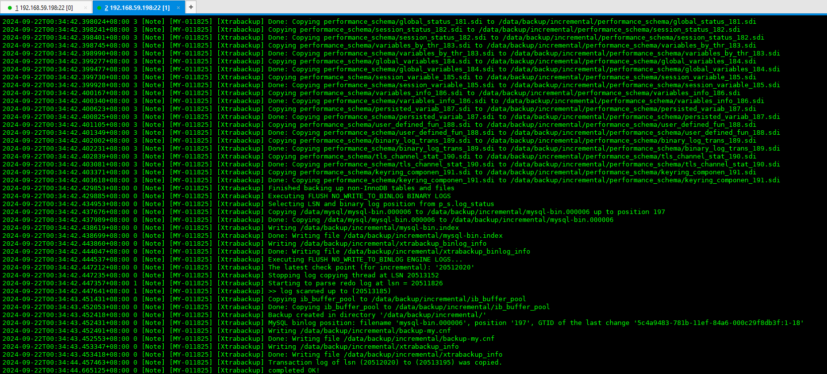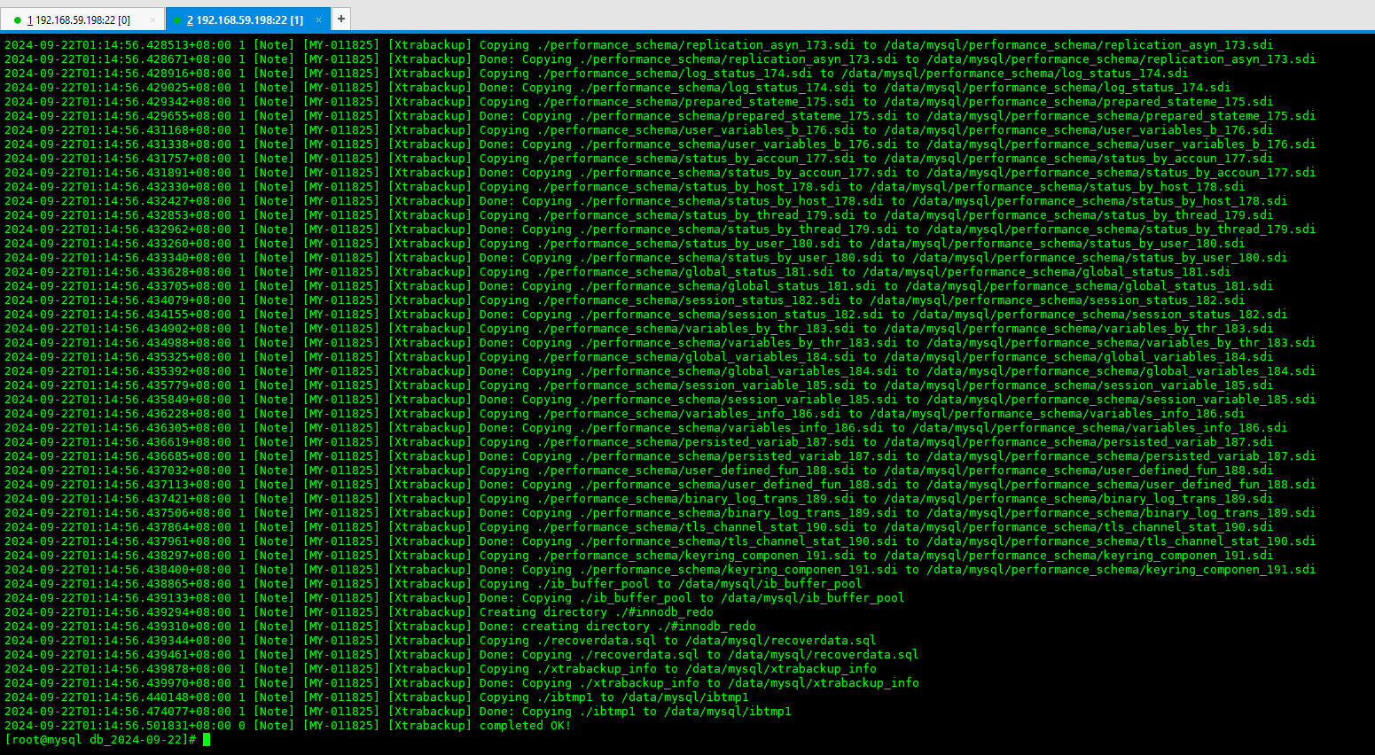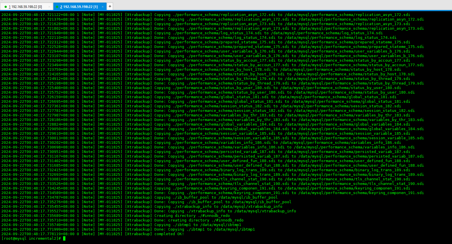 [root@mysql incremental2]#xtrabackup --defaults-file=/etc/my.cnf --copy-back --target-dir=/data/backup/db_2024-09-22 #将备份文件从restore_dir拷贝到work_dir目录