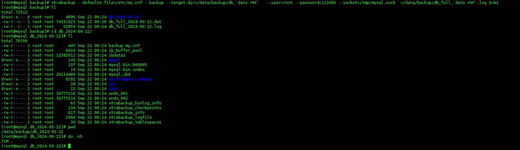 [root@mysql db_2024-09-22]#xtrabackup --defaults-file=/etc/my.cnf --user=root --password=123456 --prepare --target-dir=/data/backup/db_2024-09-22 #备份文件一致性检查