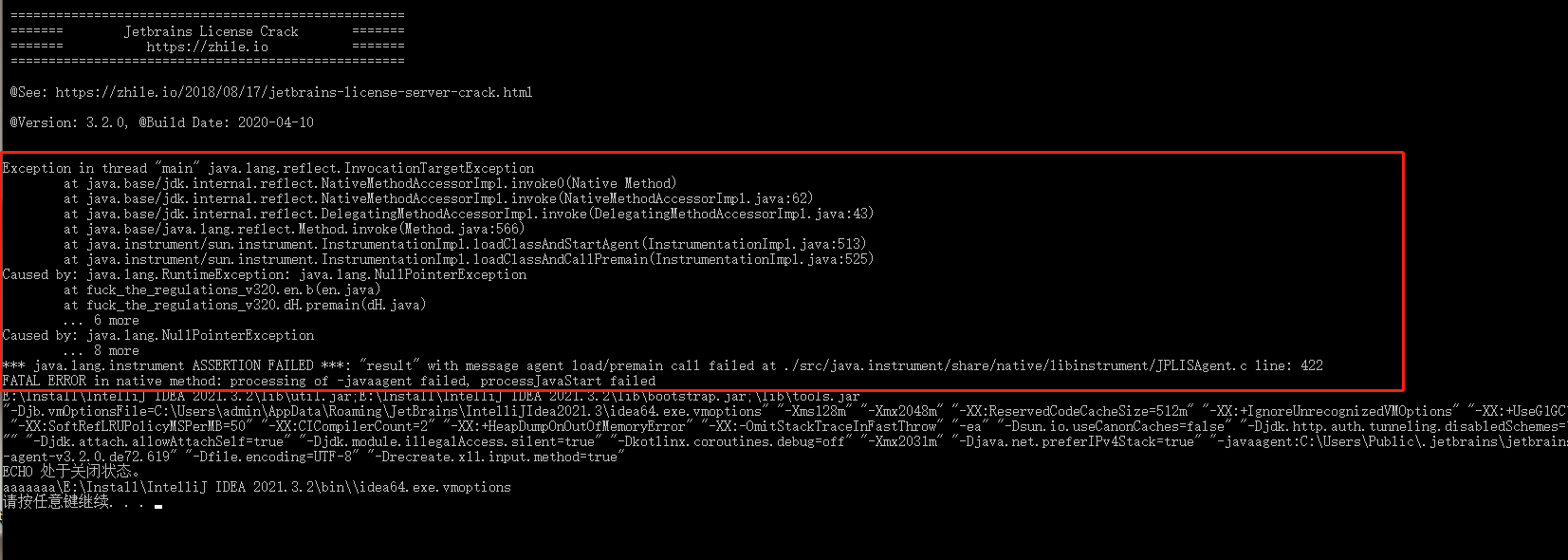 idea 2021.3 启动不了 Exception in thread "main" java.lang.reflect.InvocationTargetExceptionFATAL ERROR in native method: processing of -javaagent failed, processJavaStart failed