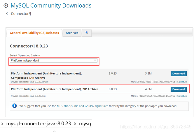 下载地址:https://dev.mysql.com/downloads/connector/j/