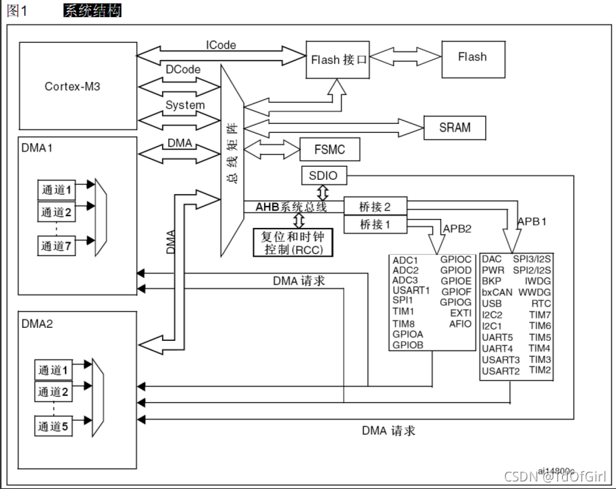 STM32总线外设及挂载外设 1、AHB总线:(1)Flash 存储器;(2)DMA;(3)复位和时钟控制;(4)CRC;(5)以太网;(6)SDIO;2、APB2总线:(1)USART1;(2)高级控制定时器TIM1和TIM8;(3)模数转换器ADC1、ADC2、ADC3;(4)SPI1;(5)外部中断EXTI;(6)复用IO,AFIO;(7)通用IO:GPIOA~G;3、APB1总线:(1)定时器TIM2到TIM7;(2)RTC;(3)WDT看门狗;(4)SPI2 、SPI3;(5)USART