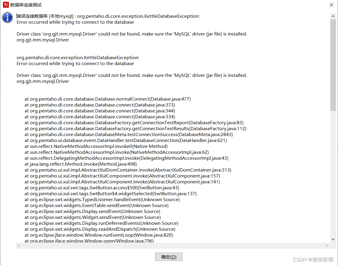前言:先说一下我使用的环境和软件版本,不同的环境】版本即使相同的问题可能处理的解决方案也是不一样;网上教程太多,处理起来也很烦;操作系统:windows10、MySQL:8.0.16 (较老) Kettle :8.2问题描述:错误连接数据库错误连接数据库 [本地mysql] : org.pentaho.di.core.exception.KettleDatabaseException:Error occurred while trying to connect to the databas.