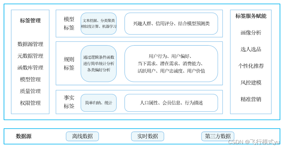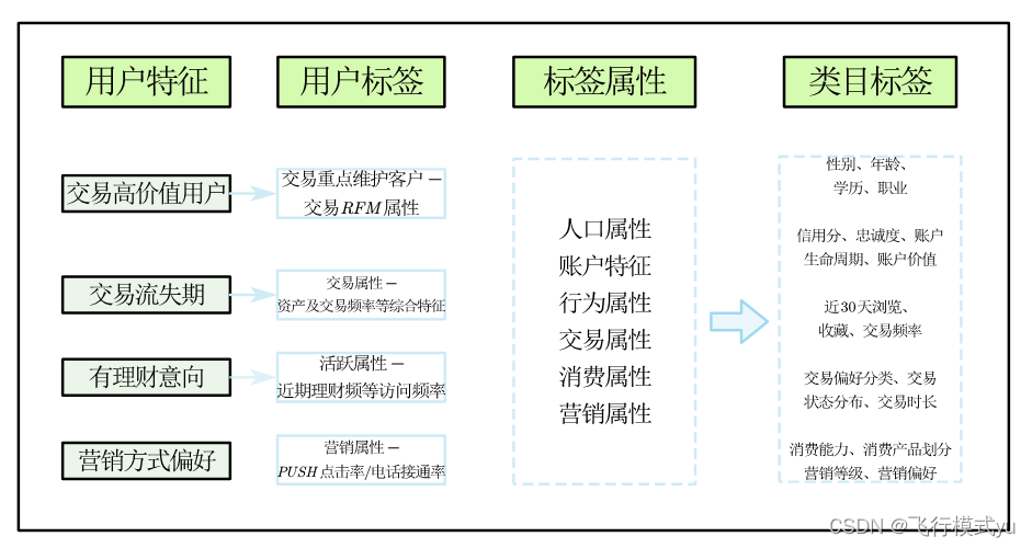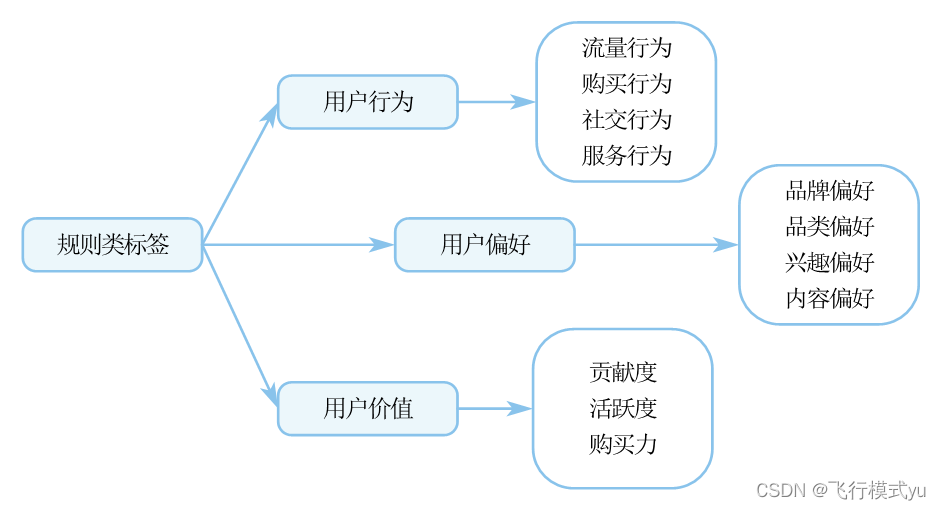 比如:基于模型类标签可以使用RFM模型来衡量用户价值和用户创利能力、对用户行为信息建模预测用户生命周期变化情况、通过模型预测用户信用评分、使用图嵌人或用户分层模型划分兴趣人群。除此之外还有很多通过模型来得到标签的方法。