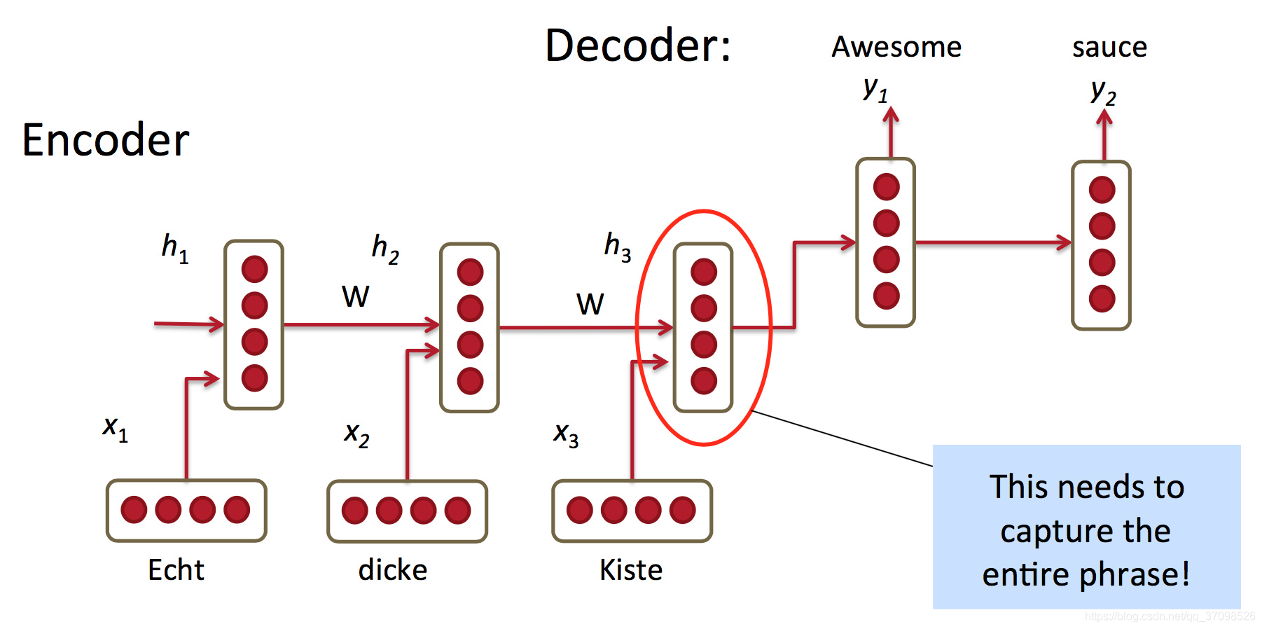 红圈所示特征表示必须能捕捉整个原文短语的语义,但是RNN无法记住太久之前的事情,大概五六个单词就到极限了。所以这不是个实用的模型。
