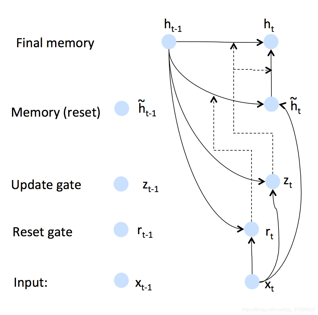 上图中,虚线代表某个gate的调节作用。隐藏层取决于上一个时刻的隐藏层和新的记忆,而update gate负责调节它们的比例,reset gate和输入共同决定新的记忆。