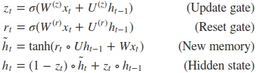 - New memory generation 与GRU的New memory generation类似。使用当前词语
