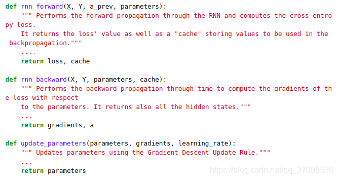 gradients = {"dWaa": dWaa, "dWax": dWax, "dWya": dWya, "db": db, "dby": dby}
