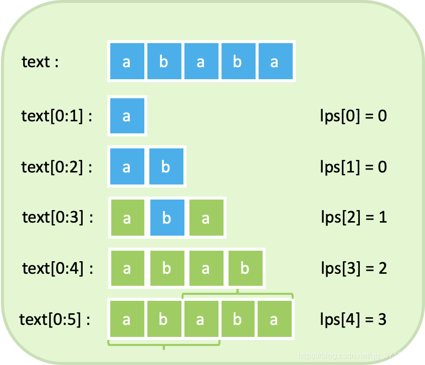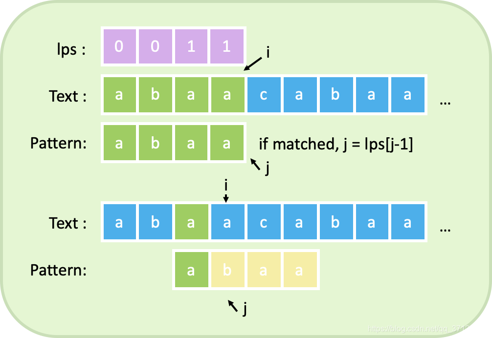 从前往后匹配当发生不匹配或者匹配成功时,把j赋值为lps[j-1],如果j为0,则 i向后移动一位.