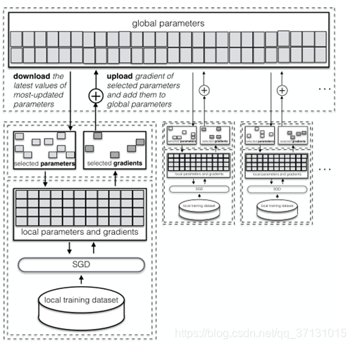 首先,用户初始化自己的模型参数,然后按照标准的SGD算法在本地用自己的数据训练模型。然后将选取参数梯度上传到全局参数。