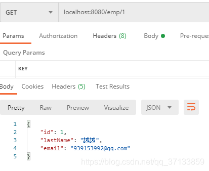 发送请求localhost:8080/emp?id=1&lastName=张三&email=48350835@qq.com