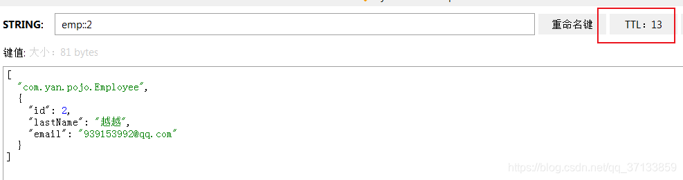 查看到redis中数据的TTL为13,说明还有13秒过期