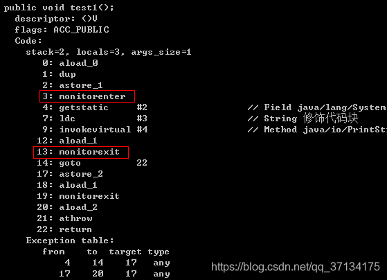 上图中 monitorexit 指令出现两次,第一次是同步代码正常执行完成的出口;第二次是同步代码出现异常时的出口。