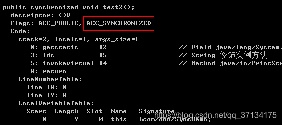 从图中发现并没有出现 monitorenter 和 monitorexit 指令,然而,常量池中多了 ACC_SYNCHRONIZED标示符,JVM就是根据该标示符来实现方法的同步的。