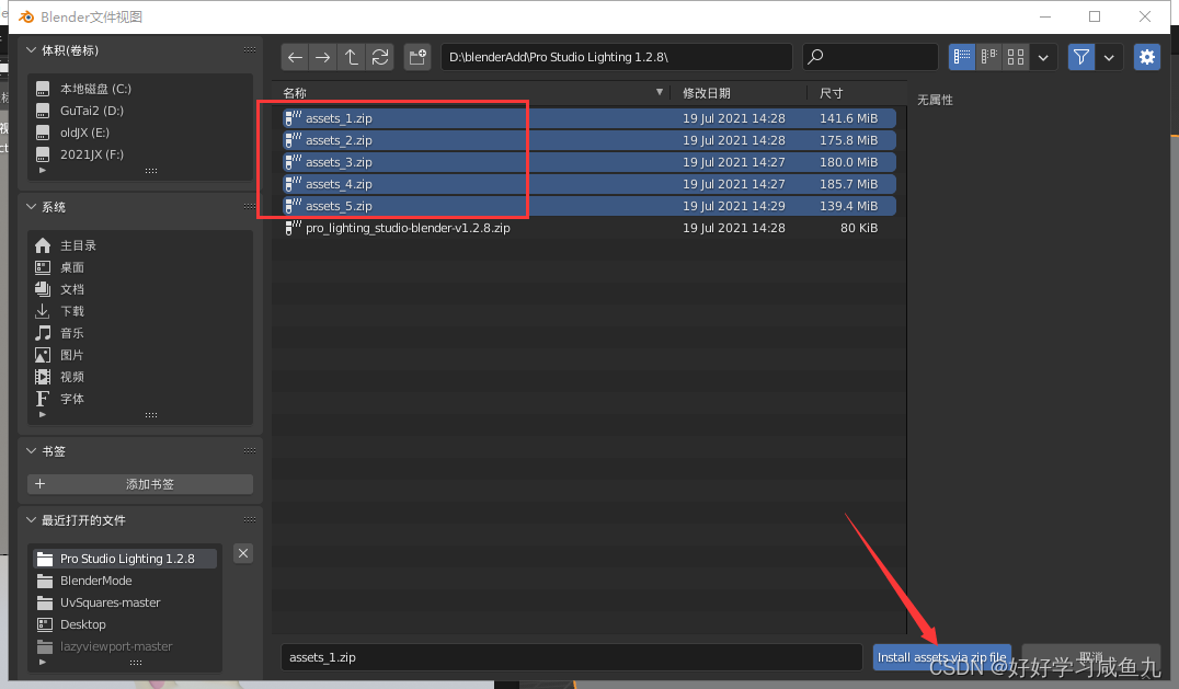 6.在弹出的对话框中,找到解压的文件目录,多选assets1-5的五个zip文件(按住shift可以多选)。然后点击右下角Install assets via zip file。