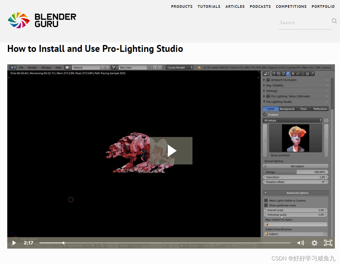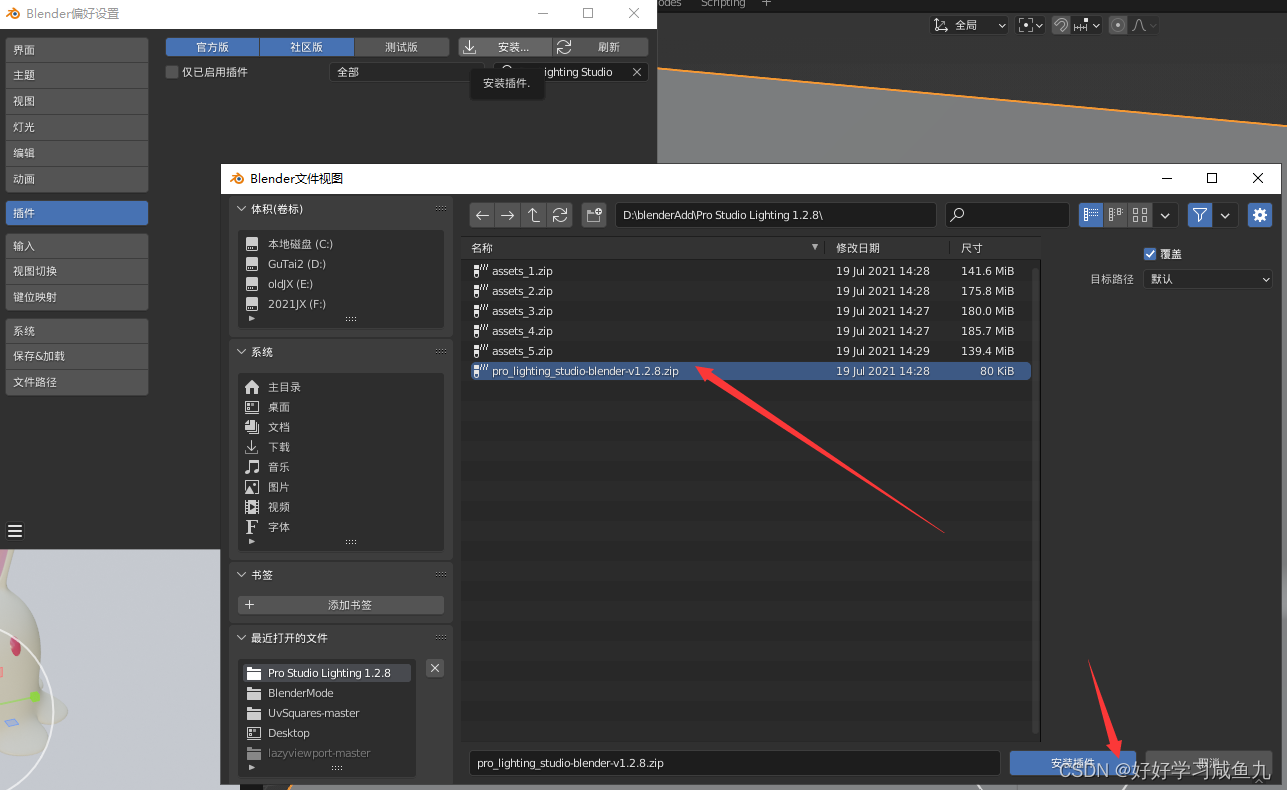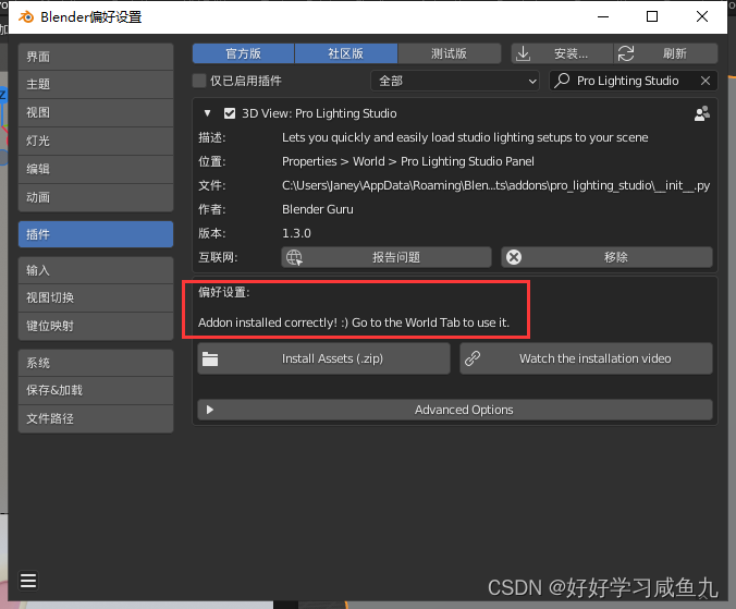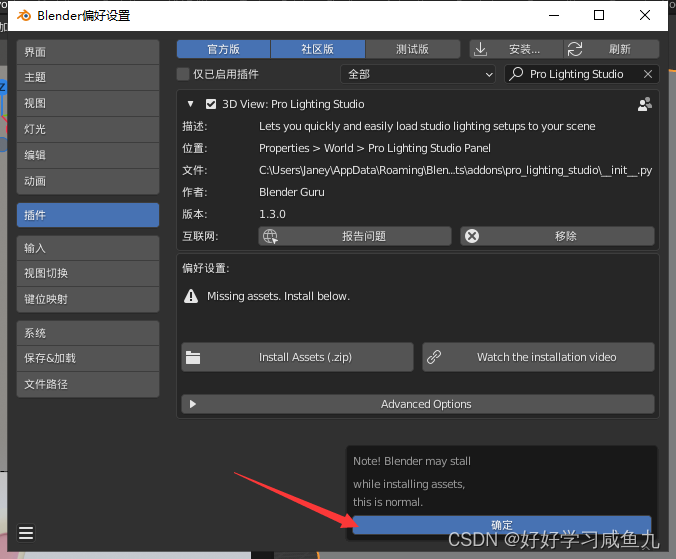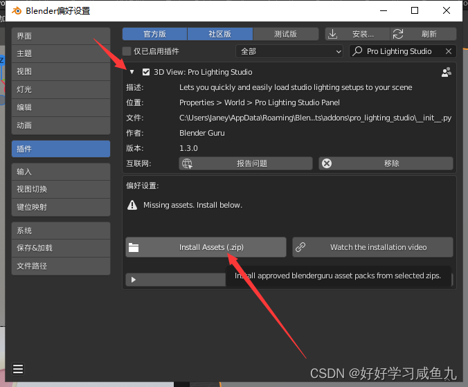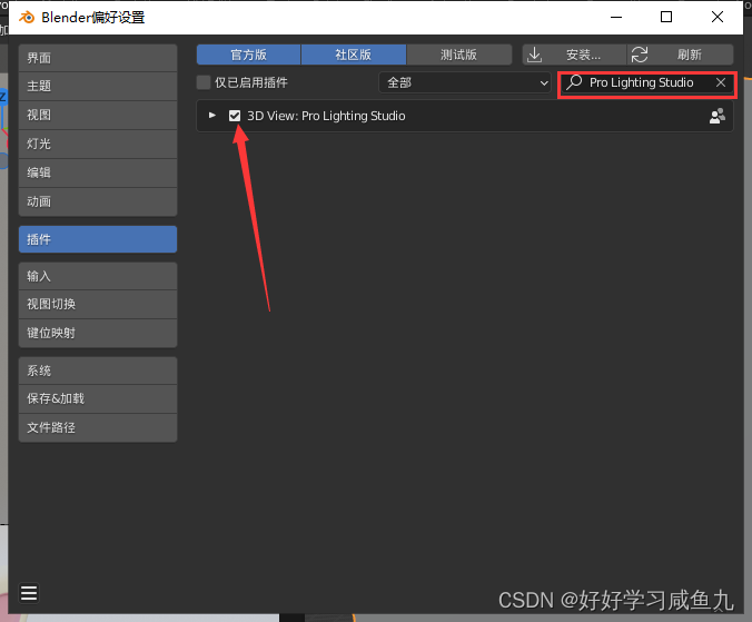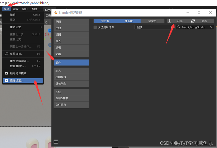 本文为在blender程序中的Pro Lighting Studio插件安装教程,使用插件版本为1.2.8,blender版本为3.1 。