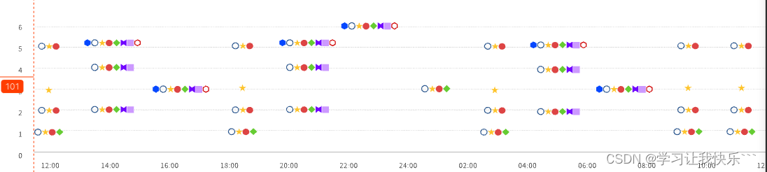 关于echarts一种另类散点图的做法 我和后端那边商量在最大放大档是一小时内数据只显示在这个小时的刻度线上,但只要滚轮放大,就显示到真实的点上。当然还是会有重叠的情况,但没必要去考虑的太细,一方面本省就不符合坐标轴的逻辑,第二那我还要考虑视口宽度,太麻烦了,最后还可能吃力不讨好,觉得做到这种程度其实也差不多,至于到秒级事件触发过于频繁,就需要后端那边去处理了,去掉那些重复事件。目前需求是要做散点图,但要求不能重叠,得横着排,这就很为难,因为我的轴是时间轴,考虑之后打算采取柱状图的方式去实现,隐藏掉柱子,只显示散点图的图标。