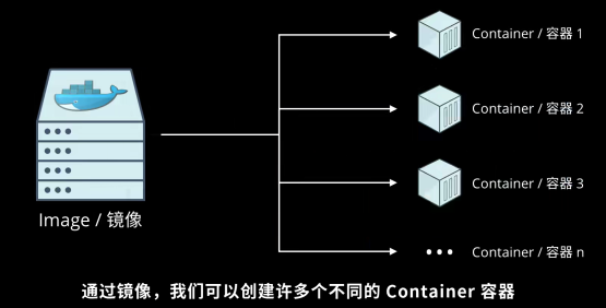 这里的容器就像是一台台运行起来的虚拟机,里面运行了你的应用程序,每个容器是独立运行的他们相互之间不影响。通过一个镜像,我们可以创建许多个不同的Container容器。