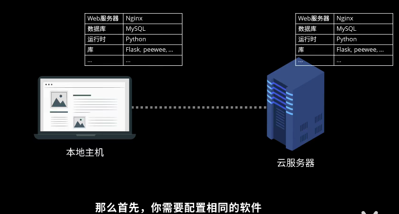 比如你写一个Web应用,并且本地调试没有任何问题。这时候你想发给你的朋友试试看或者发布部署到远程的云服务器上查看效果,那么首先你需要配置和你本地相同的软件环境,如数据库,Web服务器(IIS,Tomcat,Nginx),必要的插件,库等等。而这你还不能保证的你的软件一定能够运行起来,因为别人可能用完全不同的操作系统,即便是使用Linux每种发行版也会有微小的区别。