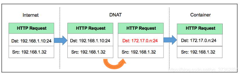 进到容器内的包做DNAT,出去的包做SNAT,这样对外面来讲,根本就不知道机器内部是谁提供服务,其实这就和一个内网多个机器公用一个外网IP地址上网的效果是一样的,对吧,那这也属于NAT功能的一个常见的应用场景。