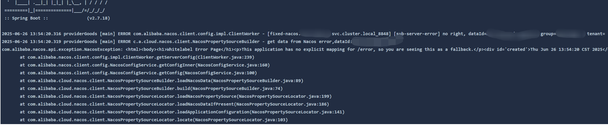 部署流水线时成功了,但是页面上点击事件时报503错误,发现是服务器的问题,就看到容器不可用,日志中就报以下错误,发现是nacos的问题