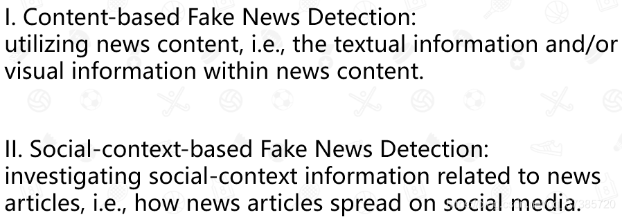 - 假新闻检测方法通常可以分为(I)基于内容的方法和(II)基于社交上下文的方法。