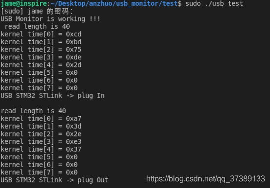 通过字符设备驱动方法,让用户和驱动程序交互。这里主要参考了suspend_monitor,使用proc_create的方法,创建/proc/usb_monitor文件。考虑程序简易性,工程中只有读方法(.read),舍去了写方法(.write)。读函数中也参考了suspend_monitor中许多保护和进程阻塞优化的部分。到此,最终实现也只要在用户程序中读取/proc/usb_monitor即可。