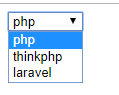 <select name="lag" id="lag"> <option value="0" selected>php</option> <option value="1">thinkphp</option> <option value="2">laravel</option> </select>