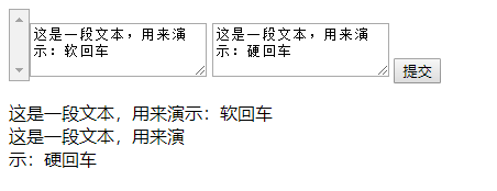 <html> <form action="" method="post"> <select name="lag" id="lag" multiple> <textarea name="a" cols="20" rows="3" wrap="soft">这是一段文本,用来演示:软回车</textarea> <textarea name="b" cols="20" rows="3" wrap="hard">这是一段文本,用来演示:硬回车</textarea> <input type="submit" name="submit" value="提交"> </select> </form> </html> <?php error_reporting(0); if($_POST['submit']){ echo nl2br($_POST['a']).'<br>'; echo nl2br($_POST['b']).'<br>'; }