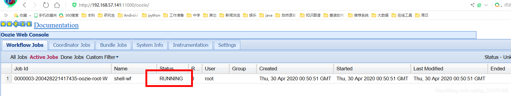 执行成功会得到job的id,并且可以在oozie的webui中看到此任务,并且状态为RUNNING