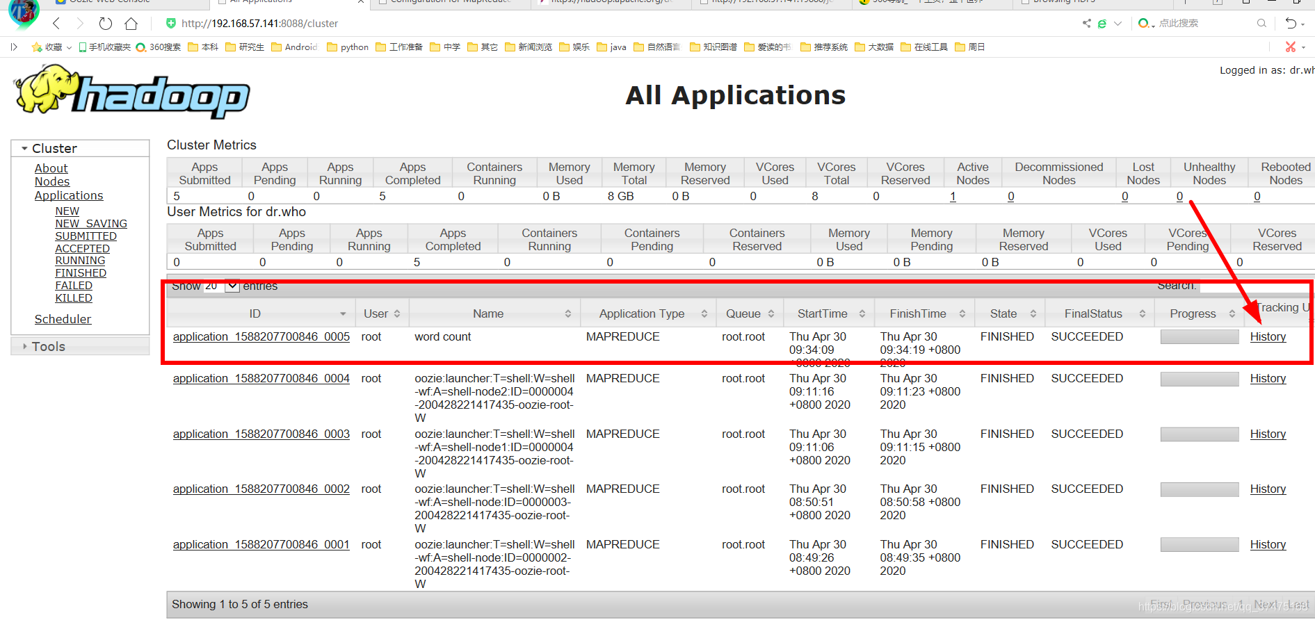 3、完成后,在集群的webui界面找到词频统计应用,点击History