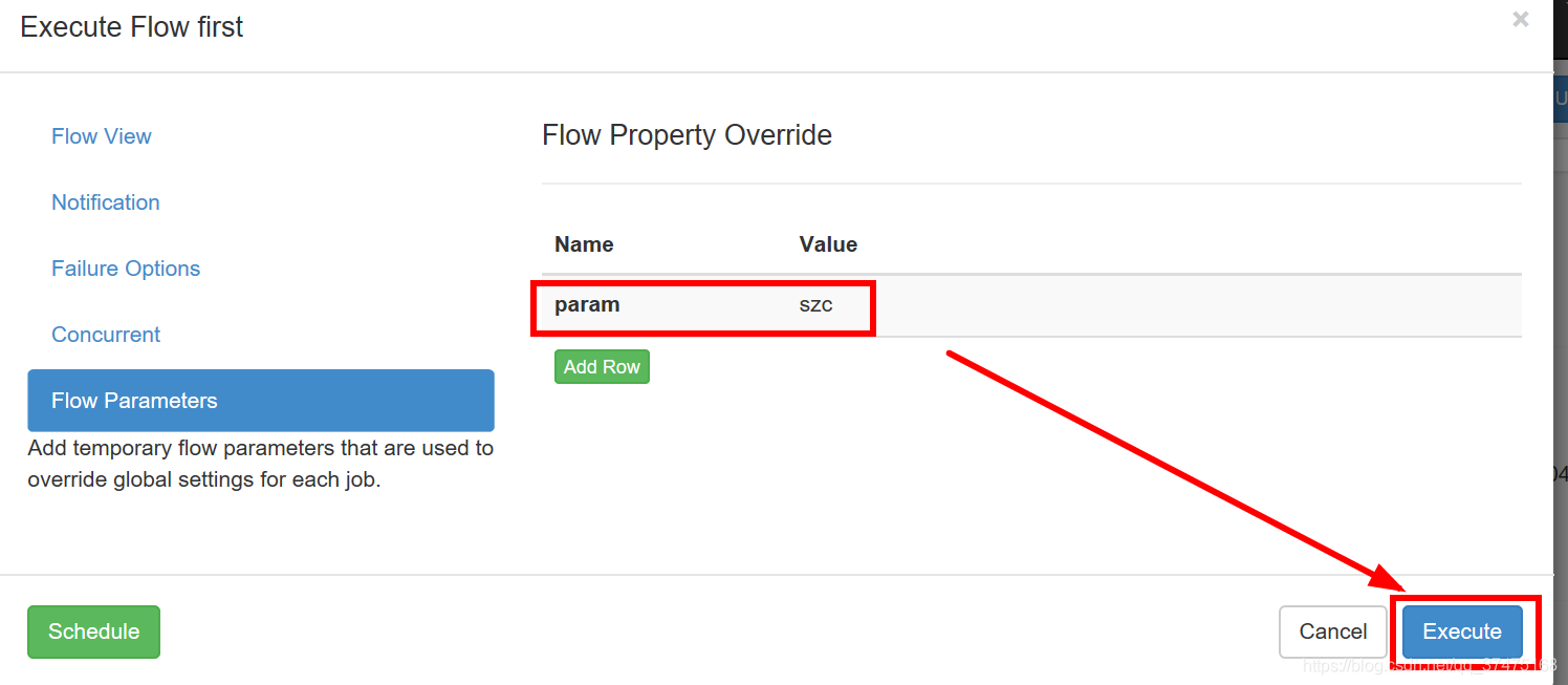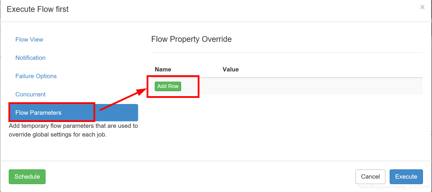 4、这样,执行这个作业的时候,在概览作业流界面点击作业流参数,点击Add Row