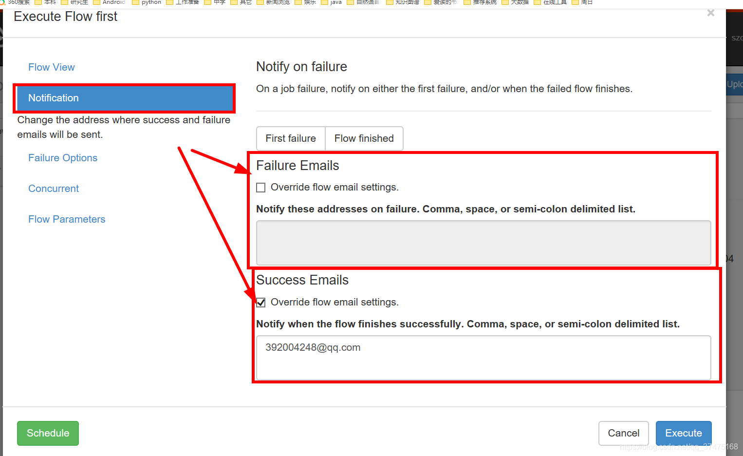 3、在web页面,执行工作流时,指定成功或失败时发送的邮箱即可