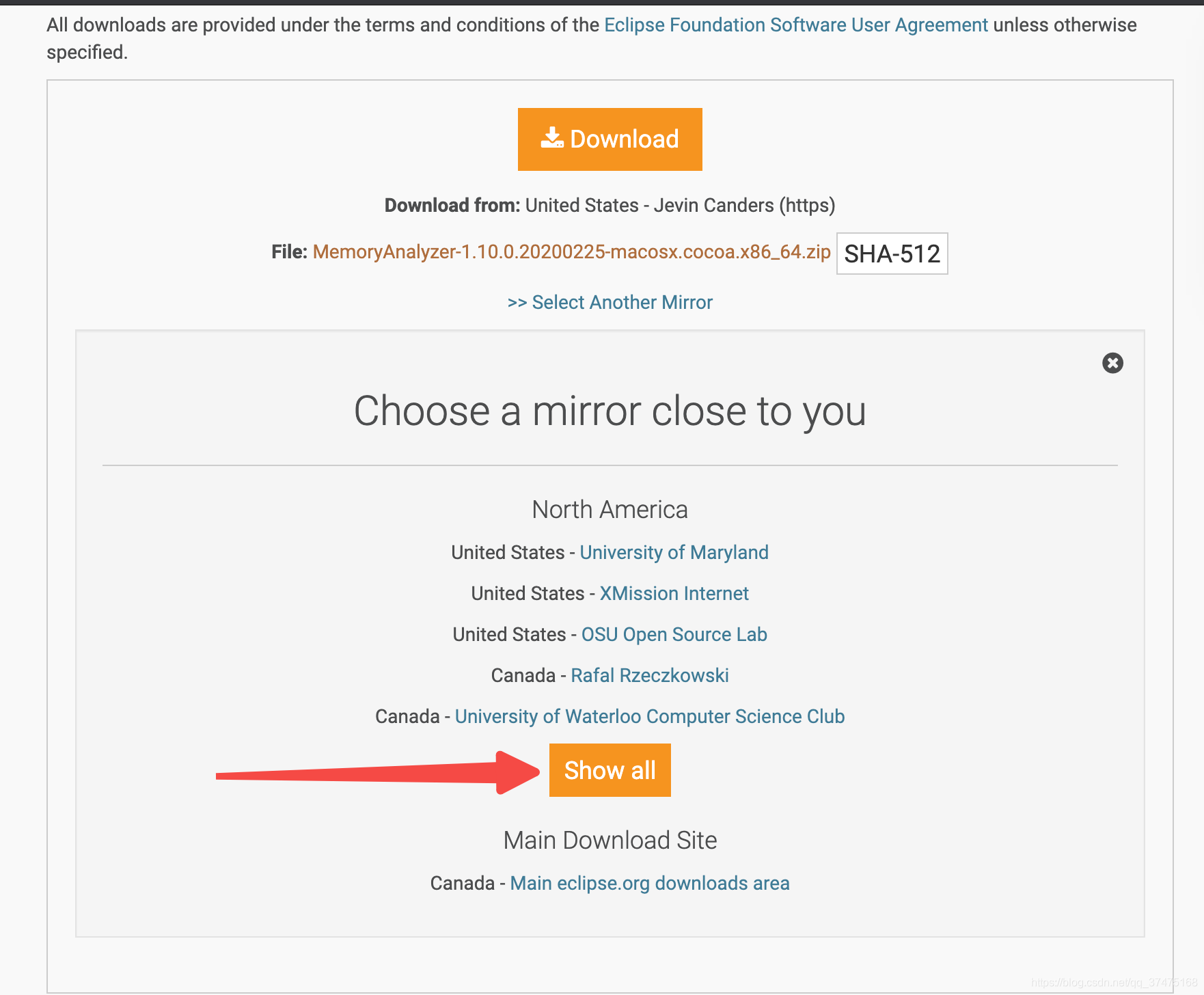 点击合适的OS版本进行下载后,在弹出的界面中,不要使用默认的加拿大镜像,否则会很慢,我们点击Show all