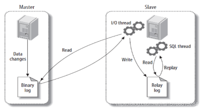 中继日志主要是MySQL主从同步的时候会用到,下图是主从同步的原理图: