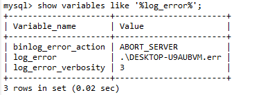 记录MySQL 运行过程中较为严重的警告和错误信息,以及MySQL每次启动和关闭的详细信息,默认是开启的,可以通过show variables like '%log_error%'查看。