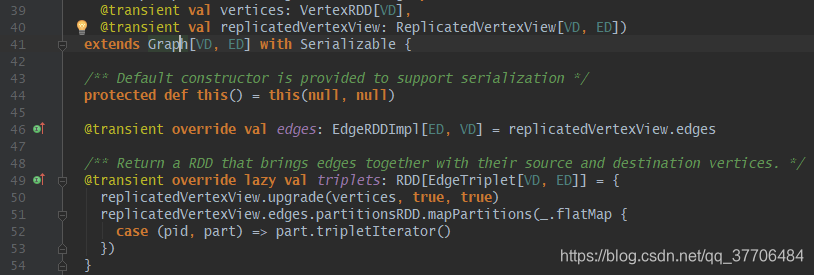 EdgeTriplet继承Edge,属性值有srcId,dstId,attr,srcAttr,dstAttr,其实就是在边上添加源点和目标点的属性值,共同组成了EdgeTriplet对象,所以如果用到边三元组就会发生顶点数据到边的迁移,即点数据移动。