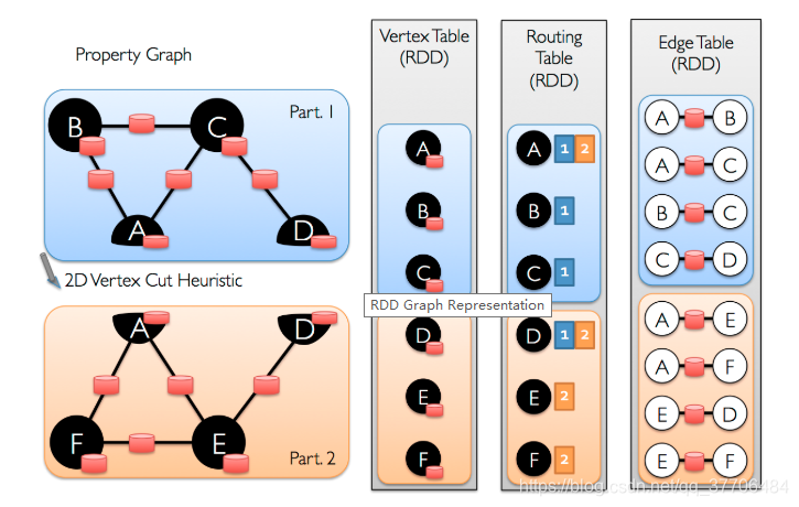 因为一般边属性多于点属性,边数量大于点数量,所以GraphX采用vertex-cut,而不是采用edge-cut,这样能减少通信和存储开销