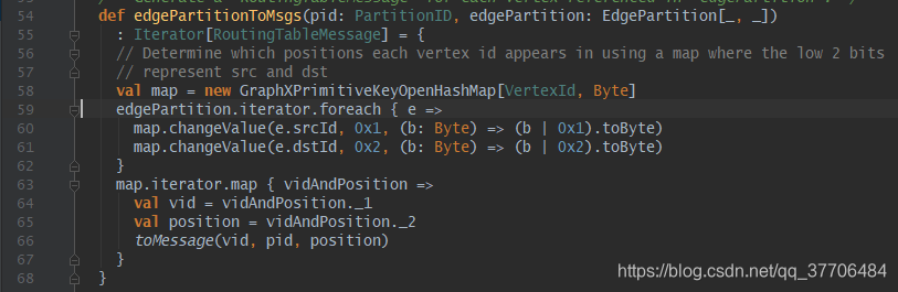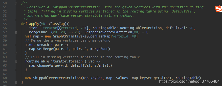 ShippableVertexPartition对象构建很简单,如果有顶点数据,先将顶点数据装载进Map里(60-62行),然后用路由表里的顶点(通过routingTable.iterator获取)补全顶点数据,用默认值填充补全顶点value(64-66行)。
