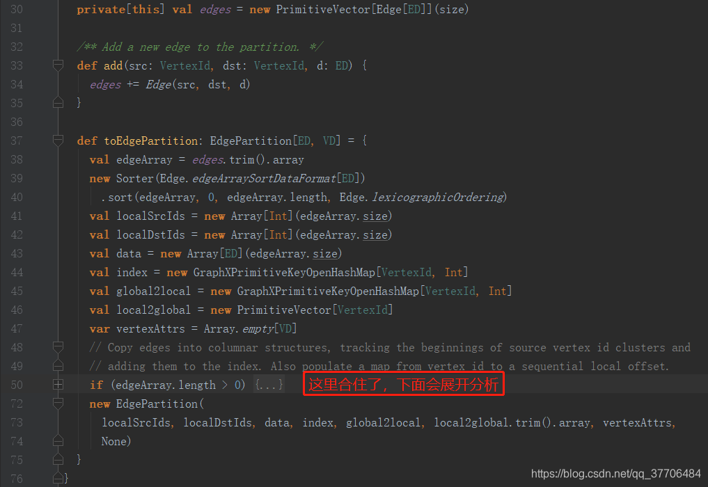 EdgeRDD[ED]是扩展和优化了RDD[Edge[ED]],构建方法只有一个fromEdges,返回EdgeRDDImpl[ED,VD],边分区保留RDD[Edge[ED]]的分区策略(对于默认采用srcId哈希分区存疑),构建过程主要通过EdgePartitionBuilder类对Edge[ED]进行转化处理。