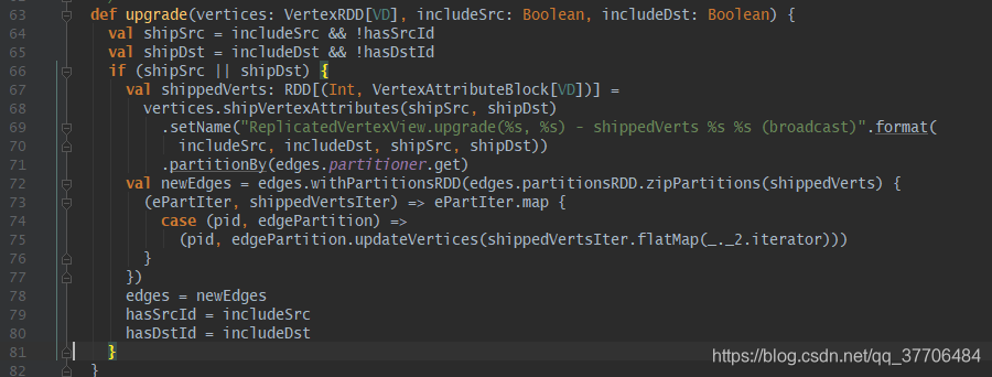 在replicatedVertexView.upgrade中核心完成了EdgePartition对象中的VertexAttrs数组的数据装载。在开始构建的EdgeRDD中VertexAttrs是空集合。upgrade方法中重点分析下vertices.shipVertexAttributes方法,利用VertexRDD中携带着的路由表信息构建出RDD[Int, VertexAttributeBlock],其数据释义为RDD[边分区ID(pid), Array[vids], Array[attrs]],其实就是构建每个顶点分区到各个边分区的顶点ID以及数据,顶点ID和数据都用数组存储,下标为对应关系,且对构建出的数据采用边分区器进行分区(还记得构建路由表是采用点分区器吧,反向过程),最终使用zipPartitions算子与edges拉链起来,装载了VertexAttrs,构建出newEdges。最后拆解边封装为EdgeTriplet。