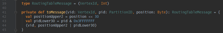 第一步构建RoutingTableMessage:edgePartitionToMsgs方法会接受两个参数,分别为边分区ID(pid)和边分区数据,这里将所有边拆解装载到Map里,用srcId或dstId作为Key,1或2标识作为Value,遍历Map调用toMessage方法转成RoutingTableMessage对象,该对象为(VertexId ,Int)二元组,元素1是顶点ID,元素2是pid和标识pos(1-srcId,2-dstId,3-srcId&dstId)按位运算得到的Int值,0-30位为pid,31-32位为标识位。
