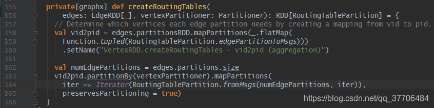 利用边数据生成路由表信息,调用createRoutingTables,这里核心就是两步,第一步:(359行)把每个边分区内的srcId和dstId都转化成RoutingTableMessage对象,记录顶点ID和边分区ID的映射关系(vid2pid),这里路由表分区和边一致,第二步:(363行)将vip2pid按顶点分区器重新分区,这里路由表分区和顶点一致,目的是保证每个顶点分区内都能得到自己含有的顶点到边的路由信息,最后将RoutingTableMessage信息拆解并构建为RoutingTablePartition返回