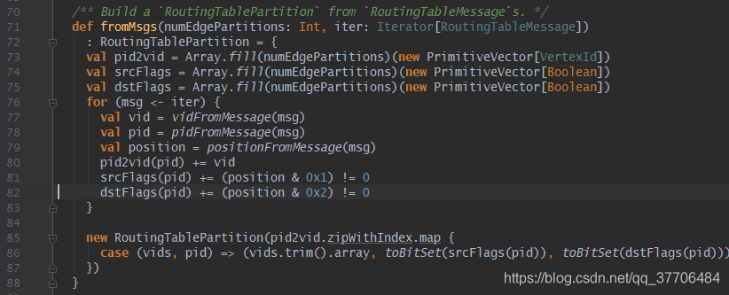 最后pid2vid.zipWithIndex.map操作得到RoutingTablePartition,为数组类型的三元组Array[(Array[vids], srcFlags,dstFlags)],下标即对应边partionId,元素1含义即为该顶点分区内,在该下标边分区内所有vids集合