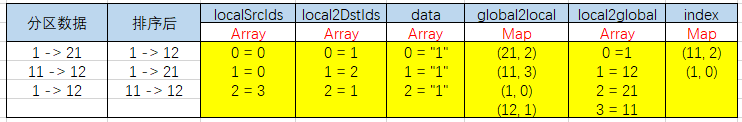 各集合的构造都是基于排序后数据。很明显,localSrcIds,localDstIds,data存放的是边拆解数据,local2global(带下标)和global2local是相反的,index是(srcId,边标)。这里再说下local2global中取数原则:1 ,12 ,1(重复),21,11,12(重复) => 1,12,21,11